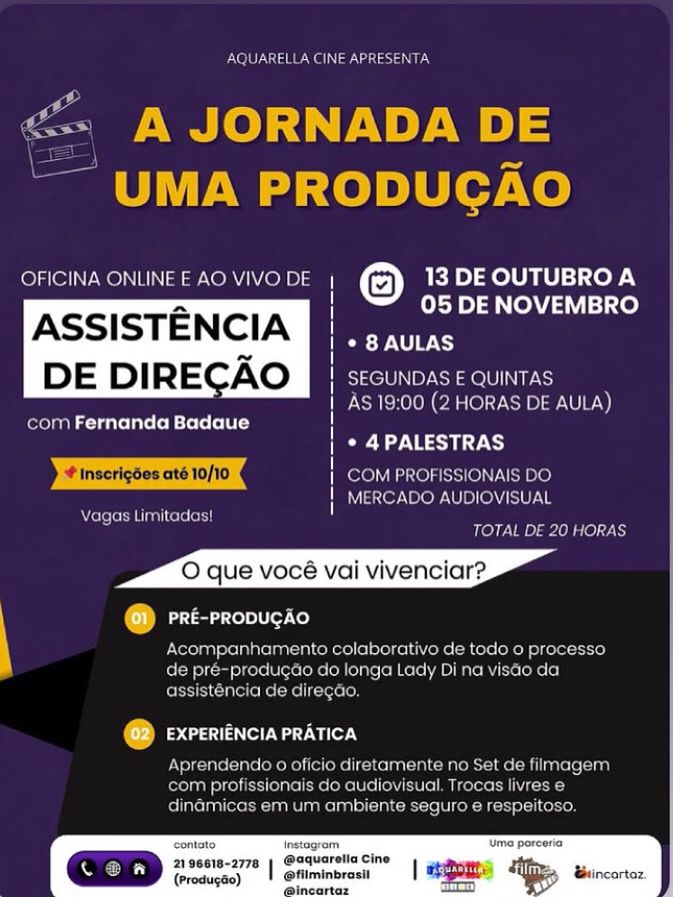 As inscrições seguem abertas até 10 de outubro e são disponibilizadas por meio deste link de Google Forms: https://forms.gle/x8LMwVPoTWYhNvHy5. As aulas iniciam no dia 13 de outubro e seguem até 05 de novembro e serão guiadas pela Fernanda Badaue, uma profissional com longa trajetória no audiovisual, onde iniciou como atriz e hoje atua como 1ª assistente de direção em longas-metragens, séries de TV e produções publicitárias. Entre seus trabalhos, destacam-se Me Chama de Bruna, Fala Sério, Mãe!, Dom, M-8 – Quando a Morte Socorre a Vida e Tia Virgínia.
